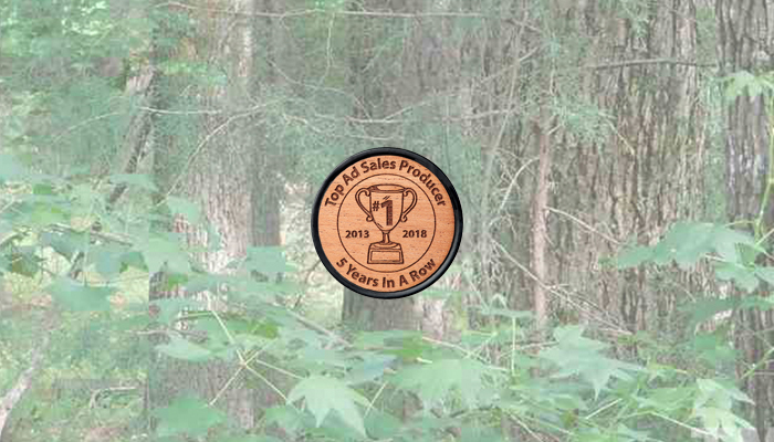 Black Powder coated metal two-sided challenge coin with a customized laser engraved wood insert on both sides.